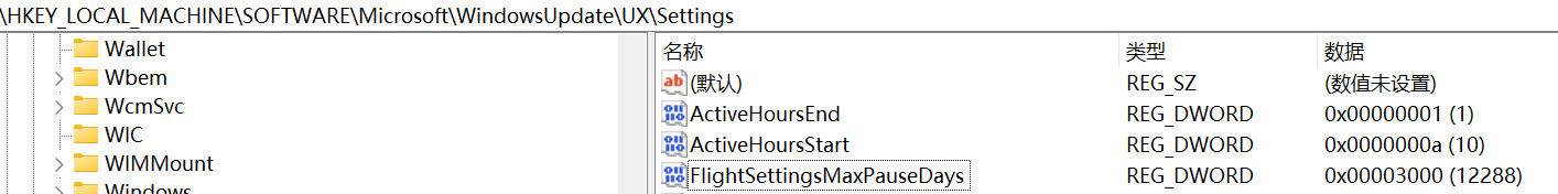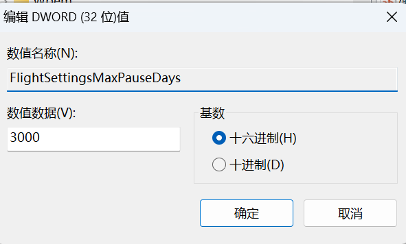 Win + R 输入 regedit 打开注册表HKEY_LOCAL_MACHINE\SOFTWARE\MICROSOFT\WindowsUdate\UX\Settings新建一个 DWORD(32位)值将名称修改为 FlightSettingsMaxPauseDays选择这个选项将数值改为 3000 往后推迟3000天更新打开设置选择 Windows更新 在暂停更新下拉就可以推迟更新